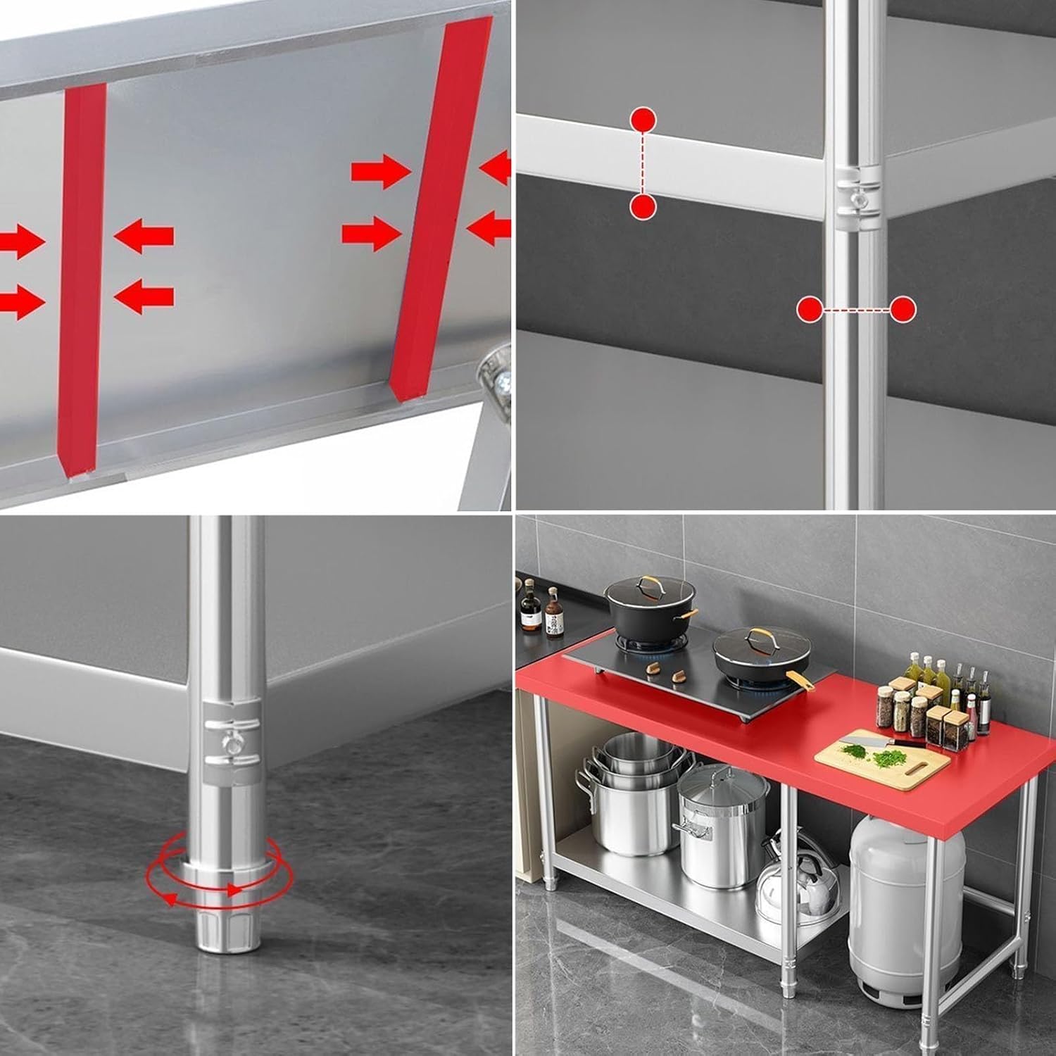Product Name: Work Platform Material: Stainless Steel Size: Height: 80cm Width 40cm, 50cm, 60cm Length: 100cm, 110cm, 120cmMulti-functional stainless steel shelf Brushed process, smooth and bright, frosted process smooth and bright easy to clean and rust-freeReinforced beams to enhance the load-bearing desktop base plate to increase the beams reinforced multiple support is not easy to shakeProduct list: workbench x1 (not including other items)Attention Note: The product is made of stainless steel, there may be slight scratches Dimensions are hand-measured and may vary slightly Due to the shooting angle, monitor and resolution, the image may have slight color difference