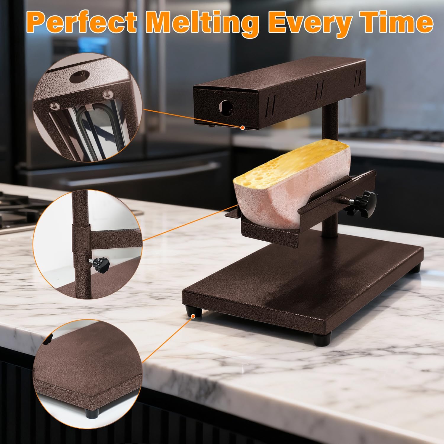 750W Cheese Melter Commercial Electric Raclette Machine—Suitable for Commercial or Home UseThis versatile cheese melter helps you prepare macaroni and cheese, cheeseburgers, cheesy apple pie, cheesy cauliflower, cheesy hot dogs, and other delicious dishes. Ideal for bakeries, cake shops, homes, restaurants, and more.Heats round, triangular, square, and sliced cheeses.Dimensions: 13" x 8.5" x 13.5"Cheese Holder: 9" x 4"Heating Area: 10" x 4"Weight: 7.8pounds (3.5 kg)Power: 750W/110V1. Simple operation: Once cheese reaches a bubbly, smooth consistency, scrape it onto plates. The cheese tray rotates and tilts downward for easy scraping of melted cheese.2. Easy assembly: The heater disassembles and reassembles effortlessly.3. Adjustable distance between cheese tray and heating lid for precise control over melting time.4. This Mexican taco cheese dispenser accommodates half-moon, square, triangular, and rectangular raclette cheese.5. With 600W power, cheese reaches a bubbly, stretchy consistency within 40 seconds. Enjoy delicious raclette dishes instantly without waiting.If you have any questions, please feel free to contact us. We'd be happy to assist you.