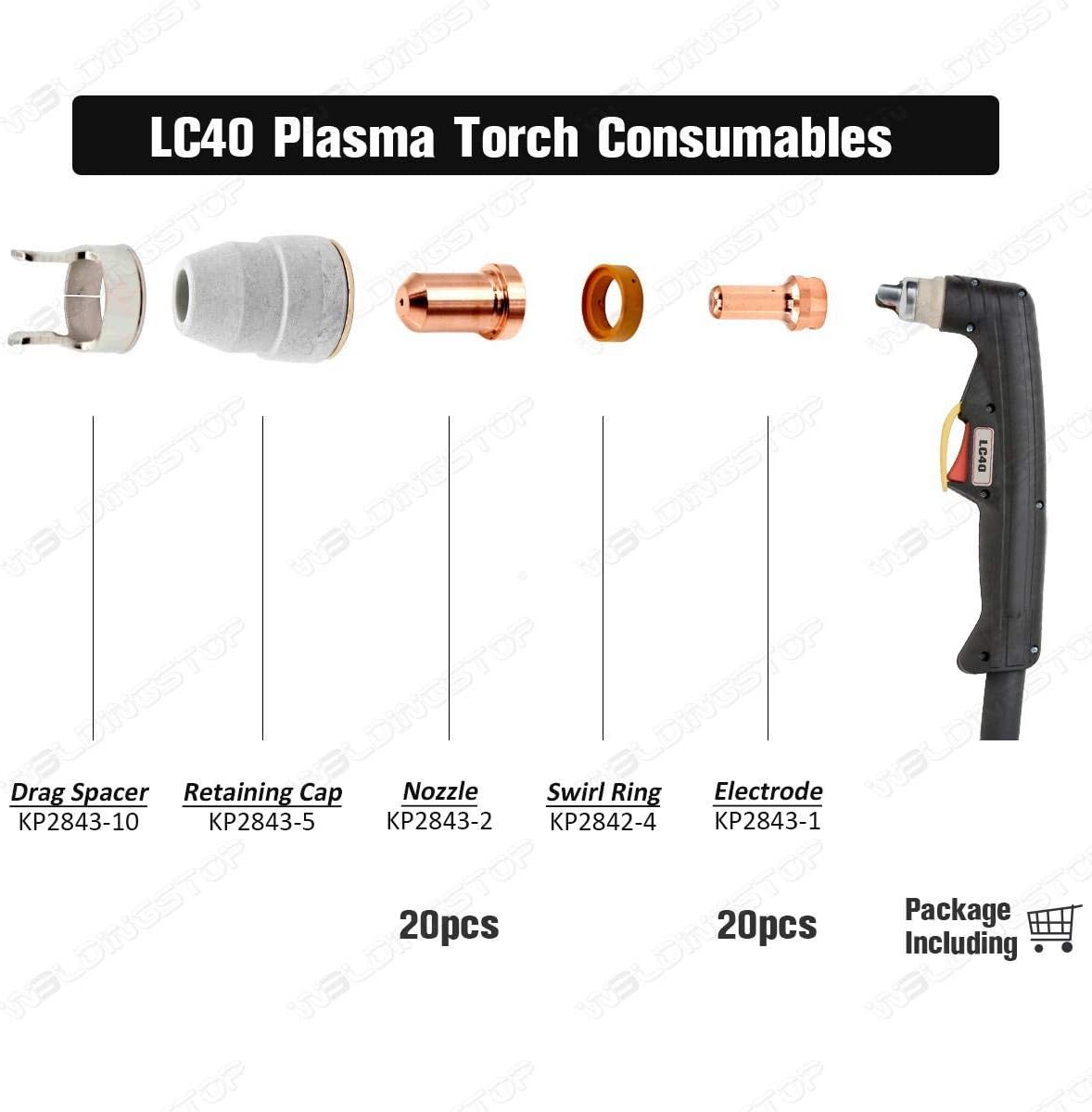 Specifications: Brand Name: WeldingStop Torch model: Fit Lincoln LC40 Torch Reference Number: KP2843-1 KP2843-2 Item Package Quantity: 40 pieces Consumables type: Plasma Cutting Electrode Nozzle List Included: Plasma Electrode KP2843-1 WSP-24001 x 20pcs Plasma Nozzle KP2843-2 WSP-24002 x 20pcs