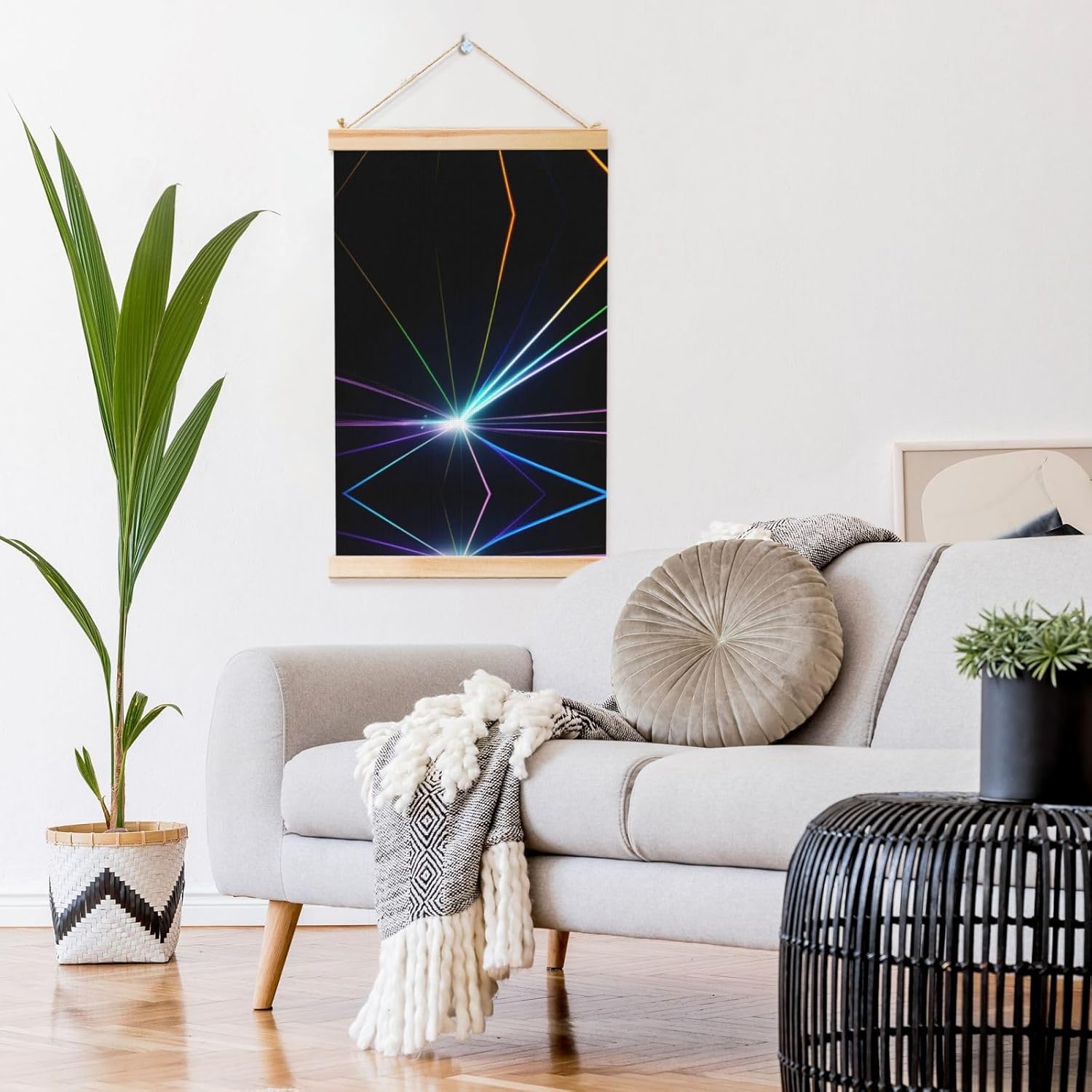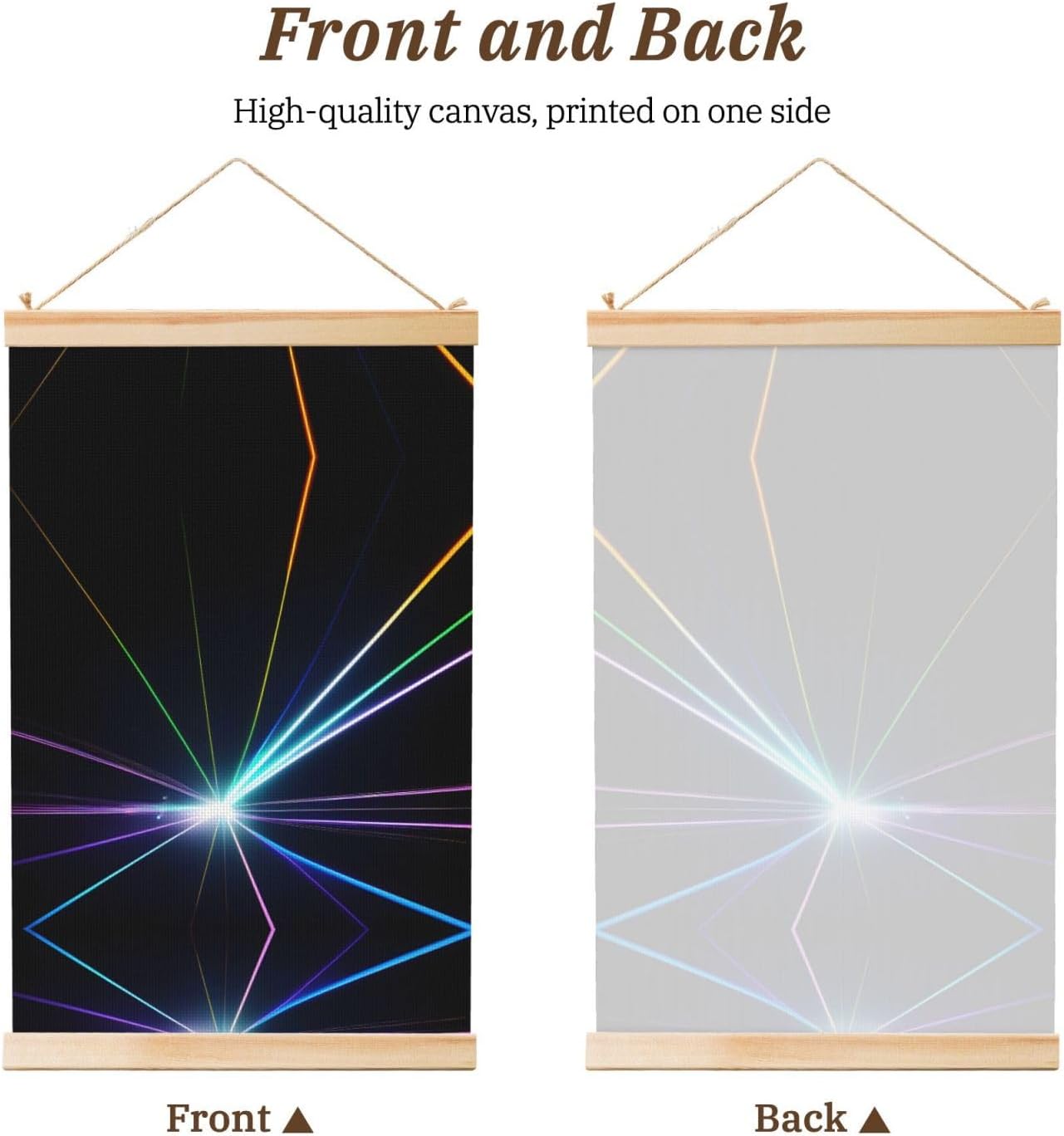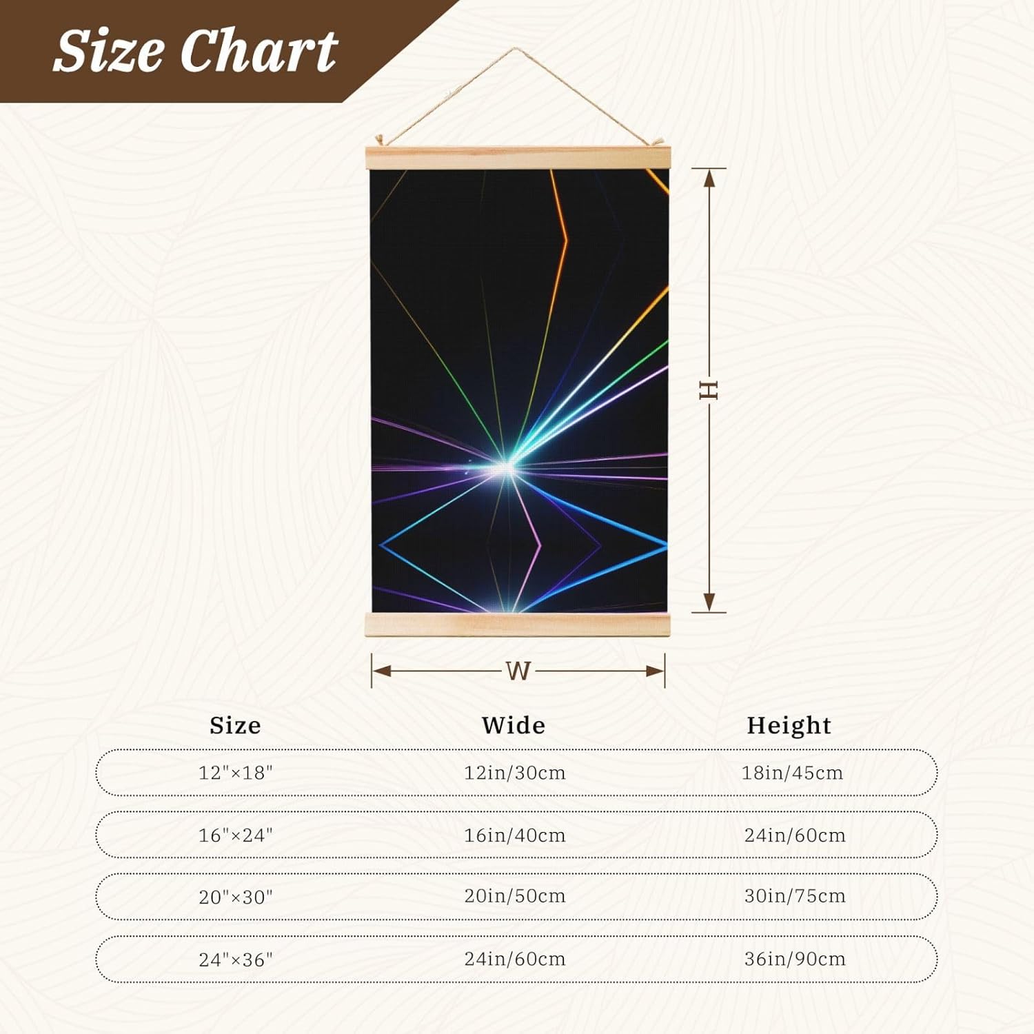 Our Laser Light Print Wooden Poster Hanger Is An Excellent Addition To Your Home Decor Or A Perfect Gift For Friends And Family. Made Of Selected Quality Canvas With Brilliant And Enduring Colors, This Wall Art Is Designed To Resist Water, Dust, And Fading, Ensuring The Bright And Vibrant Art Lasts. The Polyester Is Enclosed Between Two Teak Wood Hanger Scrolls With An Attached 35cm Rope For Easy Hanging. Installation Is Made Simple With The Included Two Nails In A Plastic Box. The Modern Minimalist Style Of Our Wall Hanging Complements Any Home Decor, Elevating The Artistic Ambiance And Brightening Up The Room. Experience The Elegant Transformation This Wall Hanging Scroll Painting Brings To Your Spaces Today.