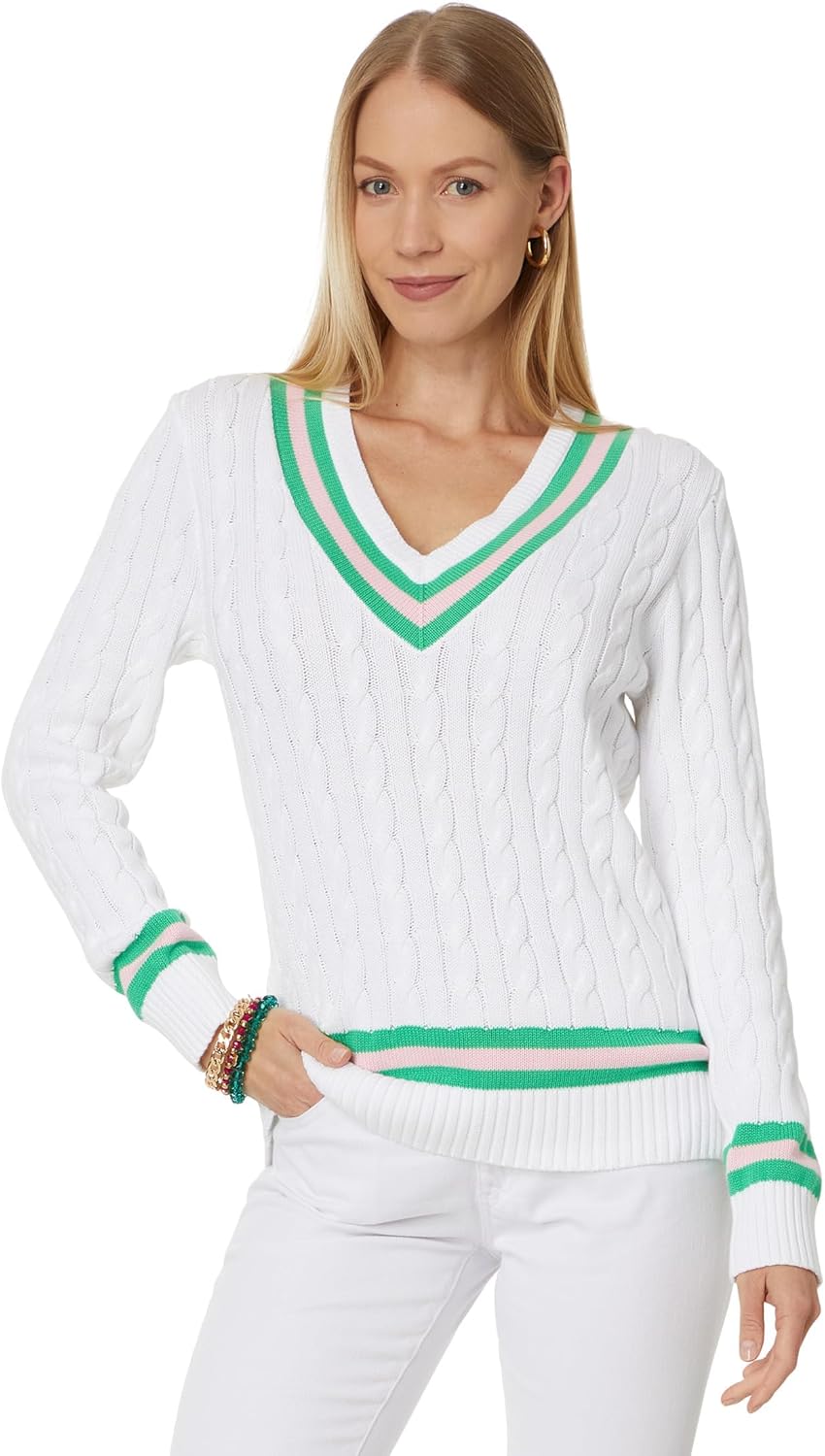 25" Straight Fit â LS vneck cable sweater with striping details at trims