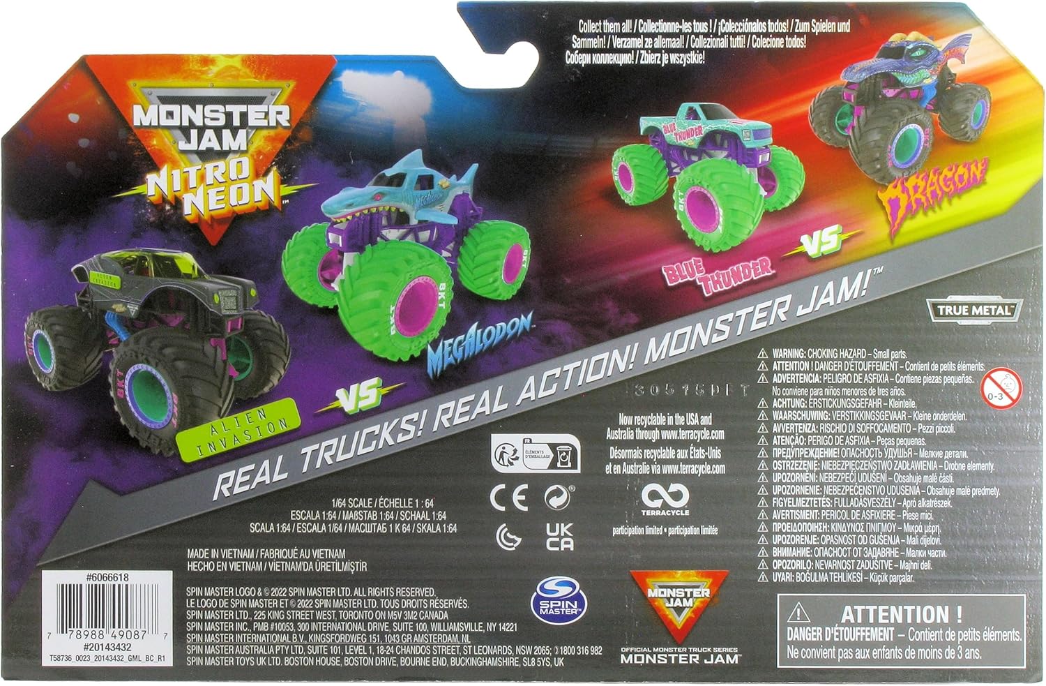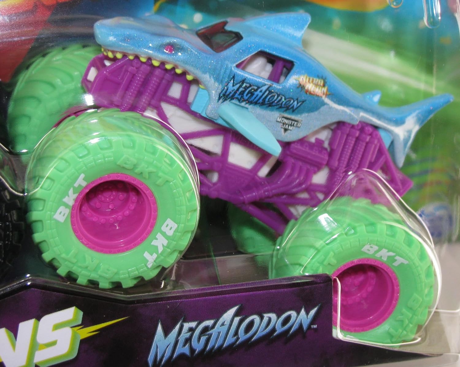 Monster Jam 2023 Nitro Neon Series 2-Pack Alien Invasion vs Megalodon. Get ready for epic showdowns with the official Monster Jam 1:64 scale die-cast trucks 2-Packs! Every 2-Pack features matchups of the most popular and sought-after Monster Jam monster trucks, like Grave Digger vs. Higher Education, Bulldozer vs. Racing Stripes, Dragon vs. Yeti and more! Each Monster Jam truck in the 2-Pack has awesome details and graphics and each toy truck has a driver molded into the driver’s seat. With official BKT Tires, stylized rims, and authentic chassis, these lean, mean, Monster Jam machines embody the style and swagger of their real-life counterparts! Unleash the Monster Jam action right out of the box and create your own stunts and jumps like you’ve seen in the live shows! Then, prepare for the ultimate Monster Jam trucks face-off! Add all of the 2-Packs to your collection (toys each sold separately) and host your very own Monster Jam event with your friends! Monster Jam monster truck toys are the perfect gifts for kids ages 3 and up. Experience head-to-head action with the official Monster Jam 1:64 scale die-cast 2-Packs!