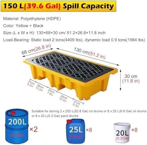 - Are you looking for a product that can help you contain spills? - This spill containment platform provides plenty of space and spillage capacity and keeps floors clean. - You can combine multiple platforms to meet different usage requirements or...- Material: polyethylene (HDPE) - Colour: yellow + black - Easy to clean: rinse with water - Scenario: warehouse workshop maintenance supermarket industrial commercial factory .Features - Modular design to fit your space - Removable grill for easy cleaning - Can be used with loader tractor and pallet jack - Nutted drain for easy draining of spills - Avoids items from slipping or other accidents during transport - Capacity is large enough for a good solution to spillage problems.Package Contents: - 1 x Spill platform/trayTips: - 1-3 cm error may exist due to manual measurement - Colour difference may exist due to the difference between the recording light and the display. Please refer to the actual product.