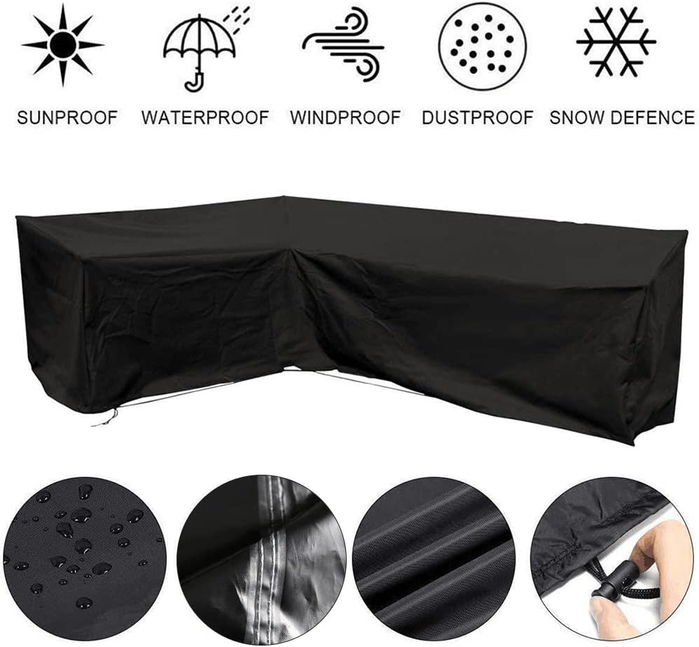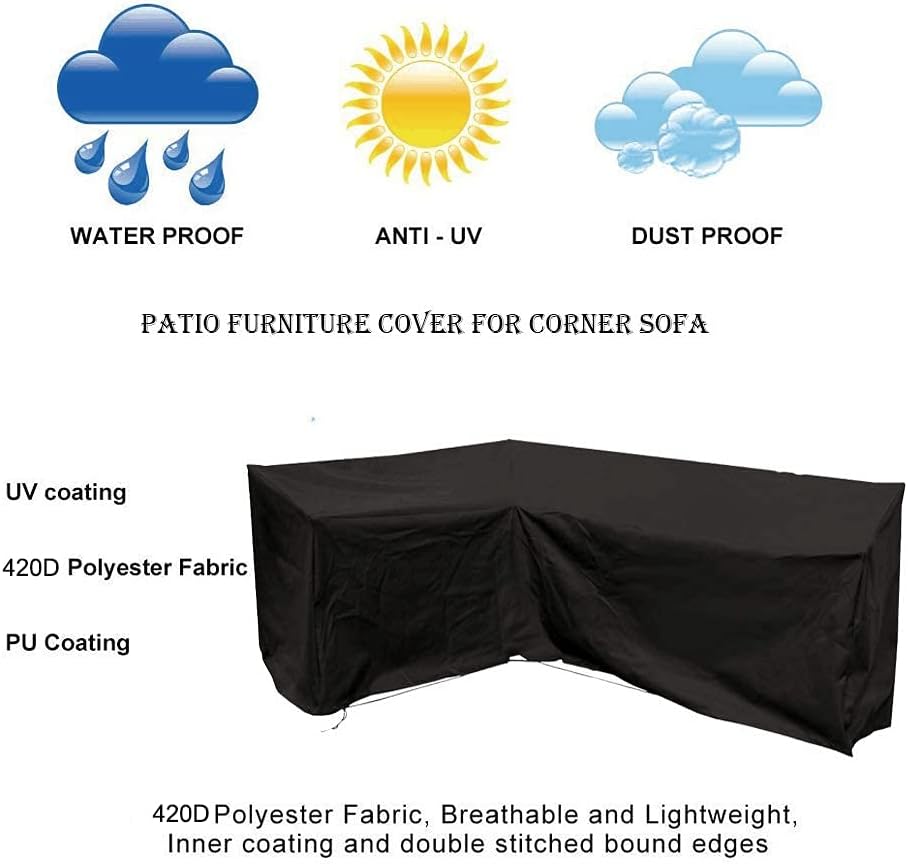 The premium patio furniture cover protect your sofa from heavy rain, wind, snow, dust, dirt and leaves. UV resistant and fade resistant. Double sewn for extra strength, tough and durable design. The air vent on the side prevent air from condensing, keep your furniture dry and clean. Not designed to entirely cover the wheels or legs. Have a handle on the cover side, making the cover easy to install and remove. There is a tightening cords at the bottom, make the cover stay stable condition, prevent wind from blowing off. Easy to clean, just wipe it with water and dry it on the sun for the next use. Material: 420D Oxford polyester. Color: Black Size : L Shape 105x78 inch / 270x200 cm L Shape 78x105 inch / 200x270 cm V Shape 105x105 inch / 270x270 cm L Shape 87x112 inch / 222x286 cm Package include: 1pc patio furniture cover. 1pc storage bag. Warm tip: Because the furniture does not happen to be a flat plane, so the low points of cover will collect water and debris. It will shorten the lifetime of cover with time going. We recommend you to put a wooden stick or round thing on the table to raise up the cover so that the water and debris can be flow down through the line. The raised part also can provide airflow between cover and furniture. Helps the furniture cover and furniture remain dry. If you have any question please feel free to contact us.
