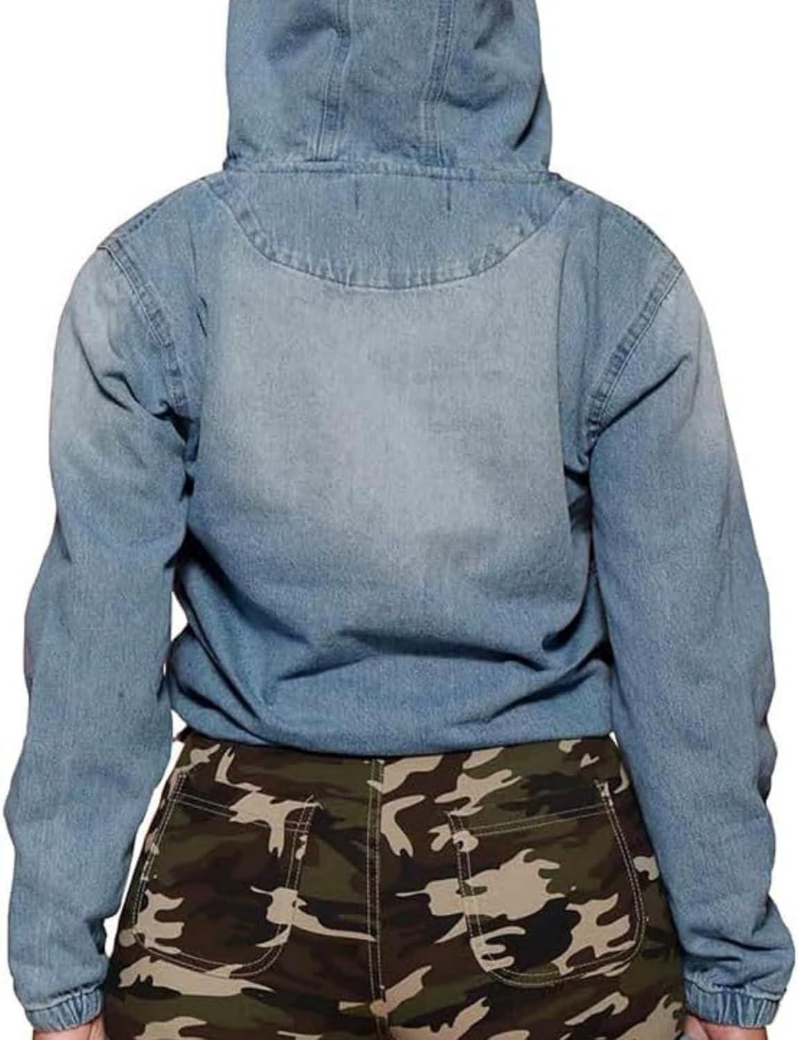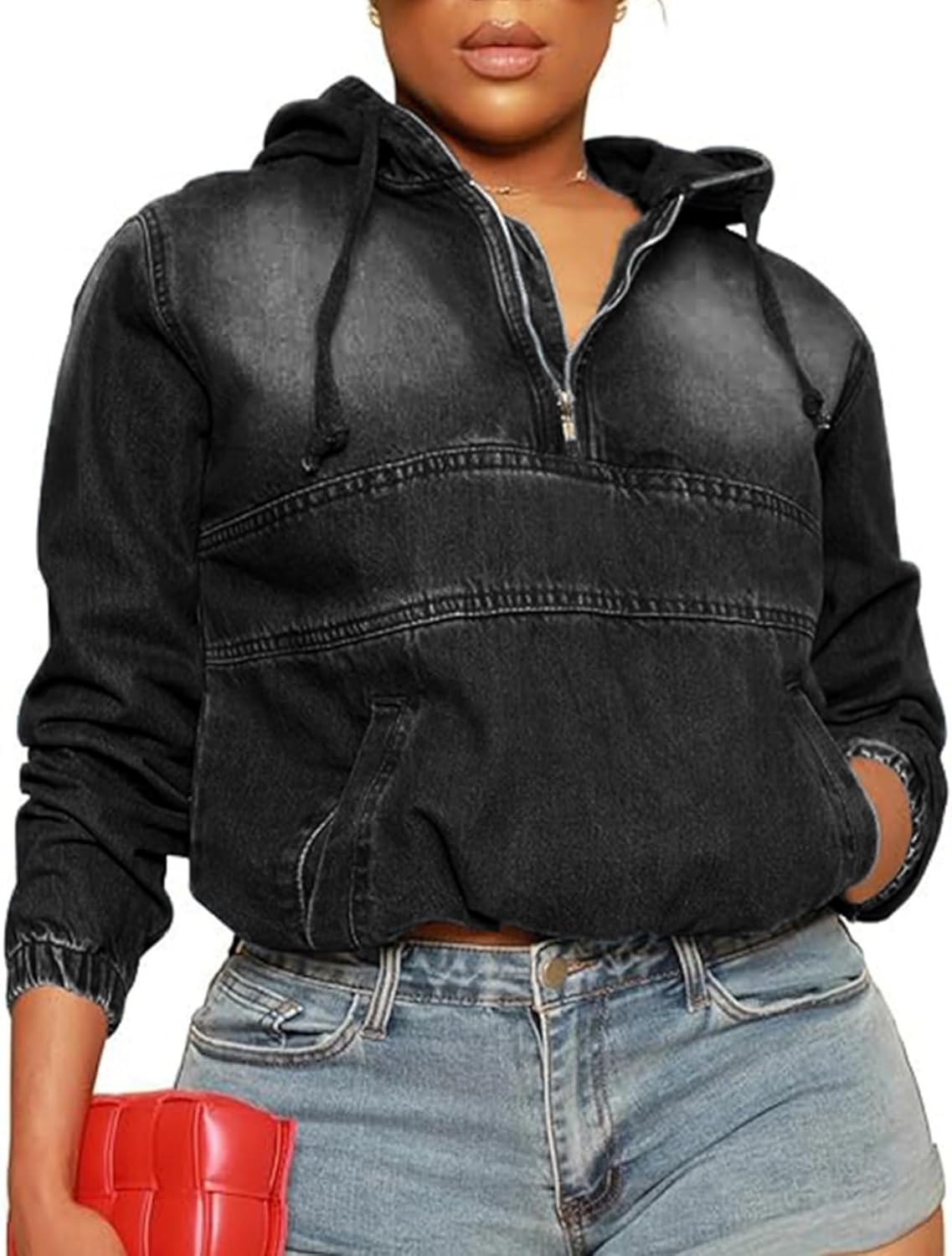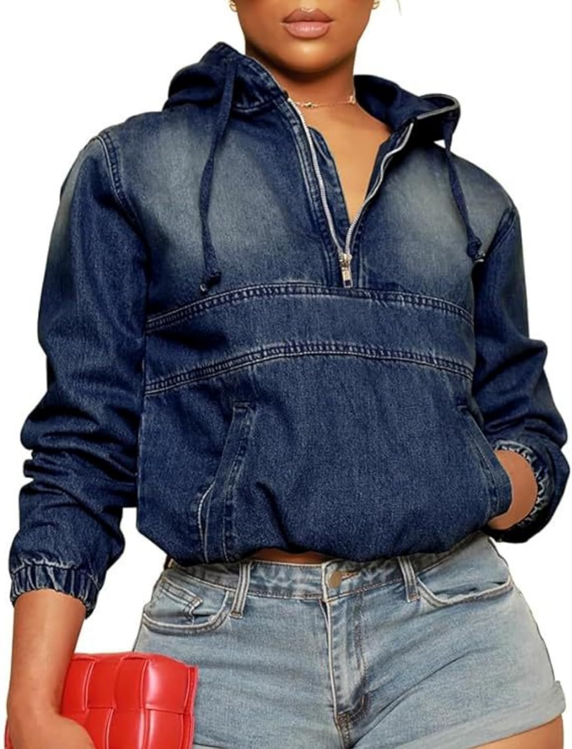 Size chart of women's half zip denim hoodie pullover: Small: Bust44.9"/114cm --- Length22.8"/58cm Medium: Bust46.5"/118cm --- Length23.2"/59cm Large: Bust48"/122cm --- Length23.6"/60cm X-Large: Bust50.4"/128cm --- Length24"/61cm XX-Large: Bust52.8"/134cm --- Length24.4"/62cm US size, please refer the size chart before ordering.
