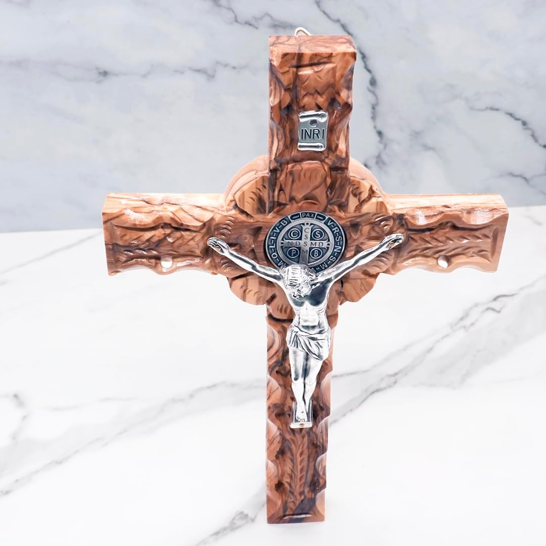 This St. Benedict wall hanging crucifix, is made of Olive wood. Made in the Holy Land by Christian artist. It is a perfect reminder of Jesus' love for us. It will bring elegance and spirit to your home. It can be hung in any room! It features Saint Benedict medal in the center of the cross. Have it blessed by a priest & the medal carries the Church's special indulgence. It is a popular devotional for many... The medal represents a prayer on the part of the user to invoke God's blessing and protection through the intercession of St. Benedict. It makes a beautiful gift for any occasion. But I am like a green olive tree in the house of God; I trust in the mercy of God for ever and ever. - Psalm 52:8