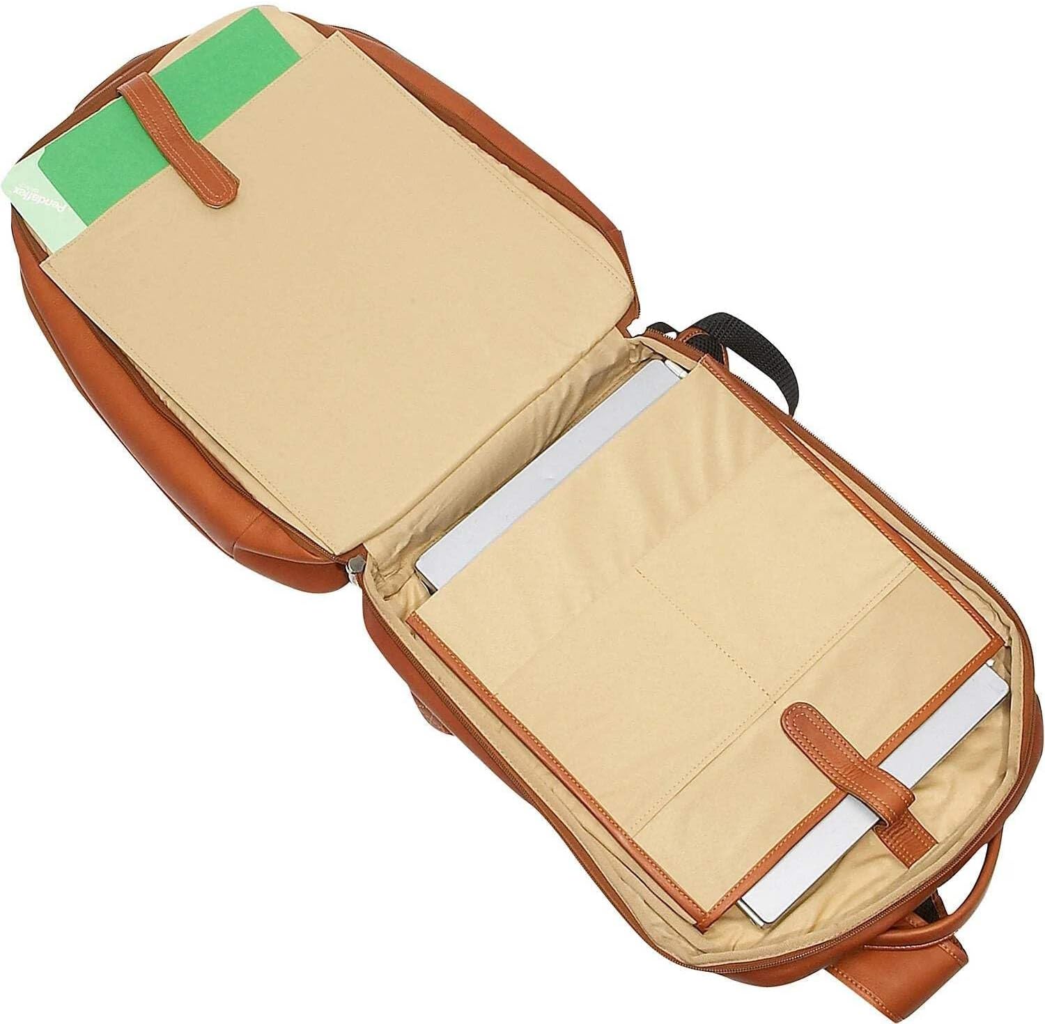 Three zippered sections. Front section contains full organizer and interior zip-pocket. Middle section zips to reveal a specious compartment. Rear section zips down completely to expedite the airline screening process and features a padded laptop pocket (11.5 x 16 x 2) and open pocket for files. Front zip-pocket, top handle, padded adjustable straps, and back strap to attach to a telescopic handle.