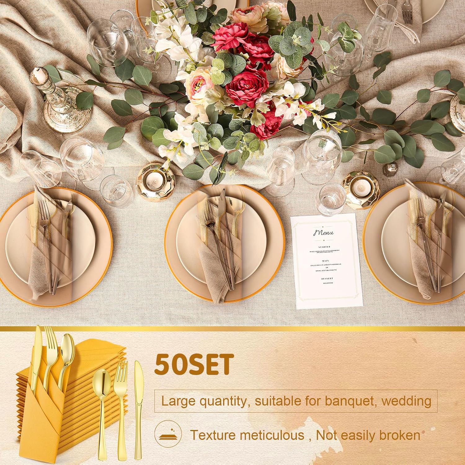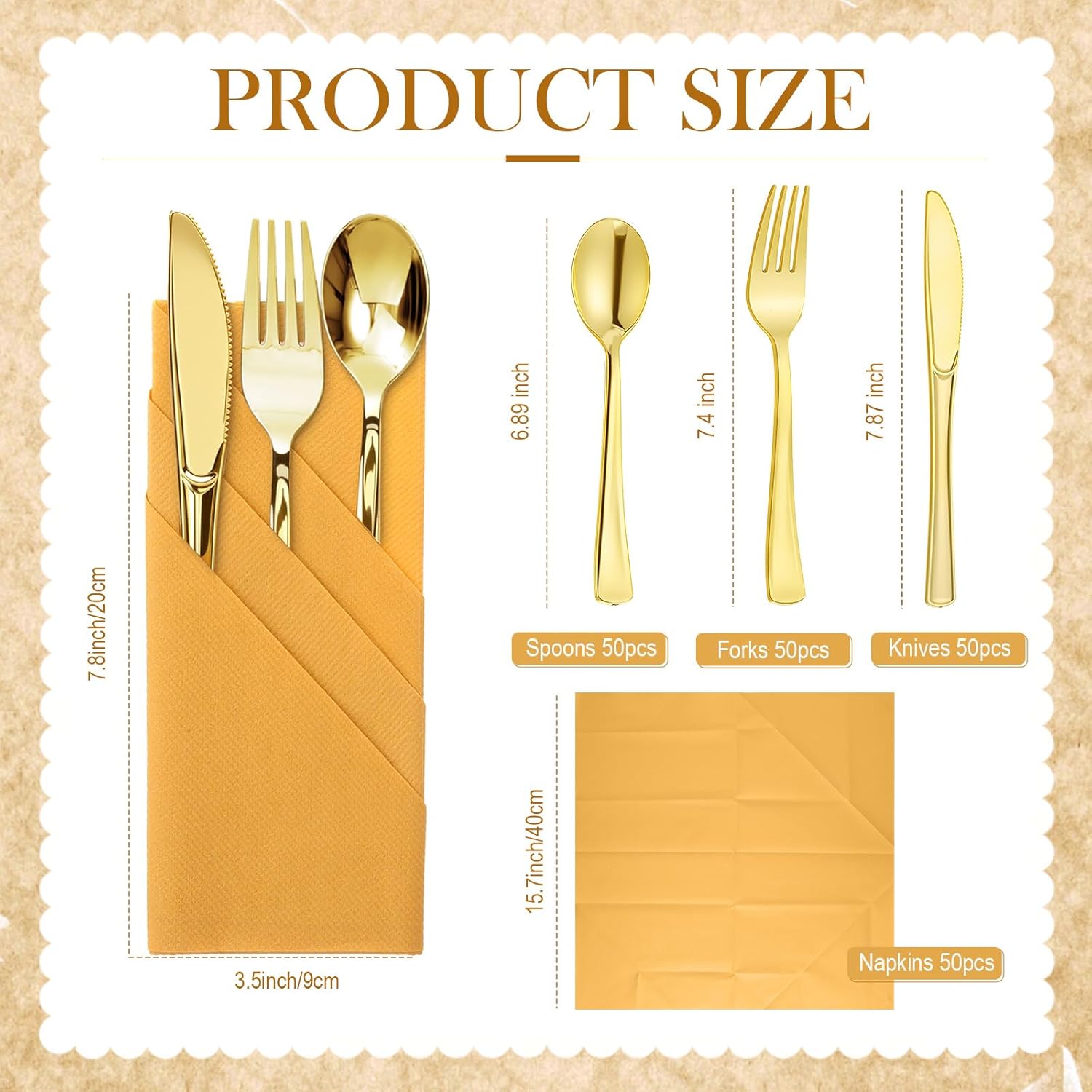 Features: Elegant Color Palette: Infuse your table setting with elegance through the ffushcia napkins and gold plastic cutlery, which add a touch of sophistication to any dining arrangement. Ideal for both formal dinners and casual gatherings, this set elevates your table decor and leaves a lasting impression on guests. Safe to Use: These paper napkins have the look and feel of linen, producing a clean and crisp feel and will not soil easily, with the same feel as cloth textiles these flatware napkins are strong enough to wash and clean out. Please note that the colors are hand-tinted, so the actual color of the napkins may vary slightly from the color in the images Specifications: Material: paper, plastic Color: gold Size: Gold napkins: sage gold napkins: about 7.87 x 3.94 inches/ 20 x 10 cm in folded size, and 15.75 x 15.75 inches/ 40 x 40 cm in unfolded size Knife: about 7.8 inch in length Fork: about 7.4 inch in length Spoon: about 6.9 inch in length Package includes: 50 x Gold napkins 50 x Knife 50 x Fork 50 x Spoon Notes: Manual measurement, please allow slight errors on size. The color may exist a slight difference due to different screen displays.