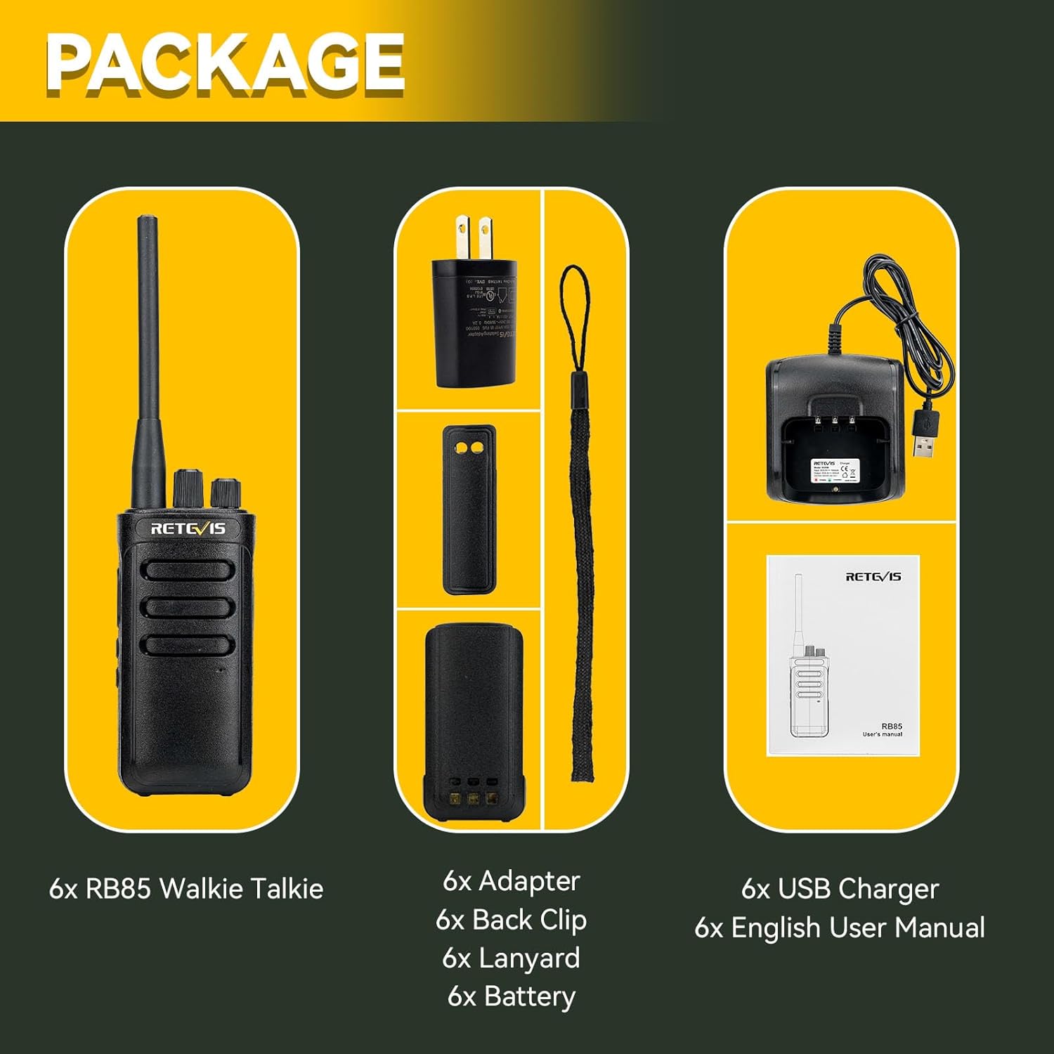 | BuiltIn Media | 6x 2000mAh Li-ion Battery, 6x Back Clip and Lanyard, 6x RB85 Intelligence Noise-cancelling Walkie Talkie, 6x USB Charger and Adapter, User Manual |