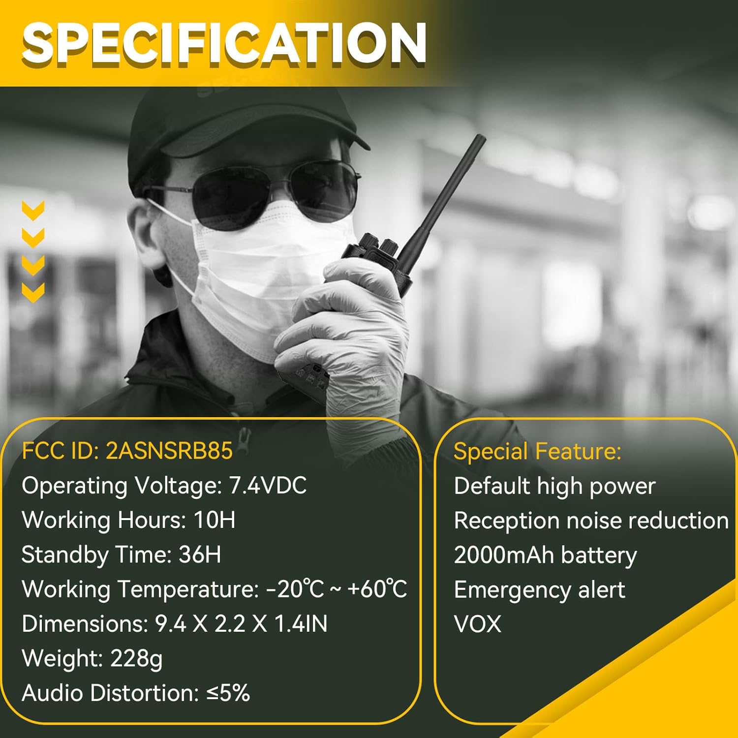 | Additional Features | Easy to use, High power long range 2 way radio, Intelligent noise reduction, Local and remote emergency alarm, Support CHIRP; VOX; sql |