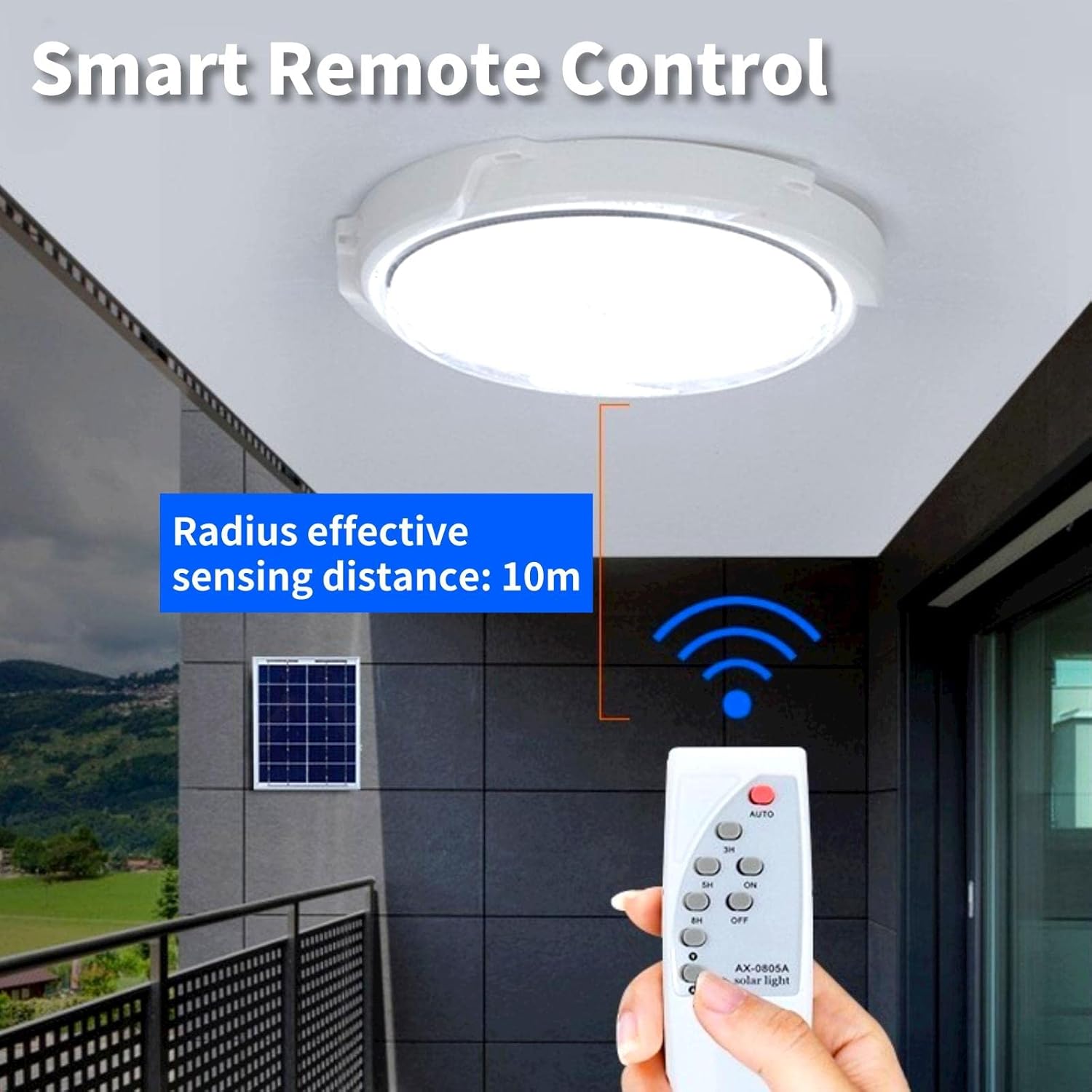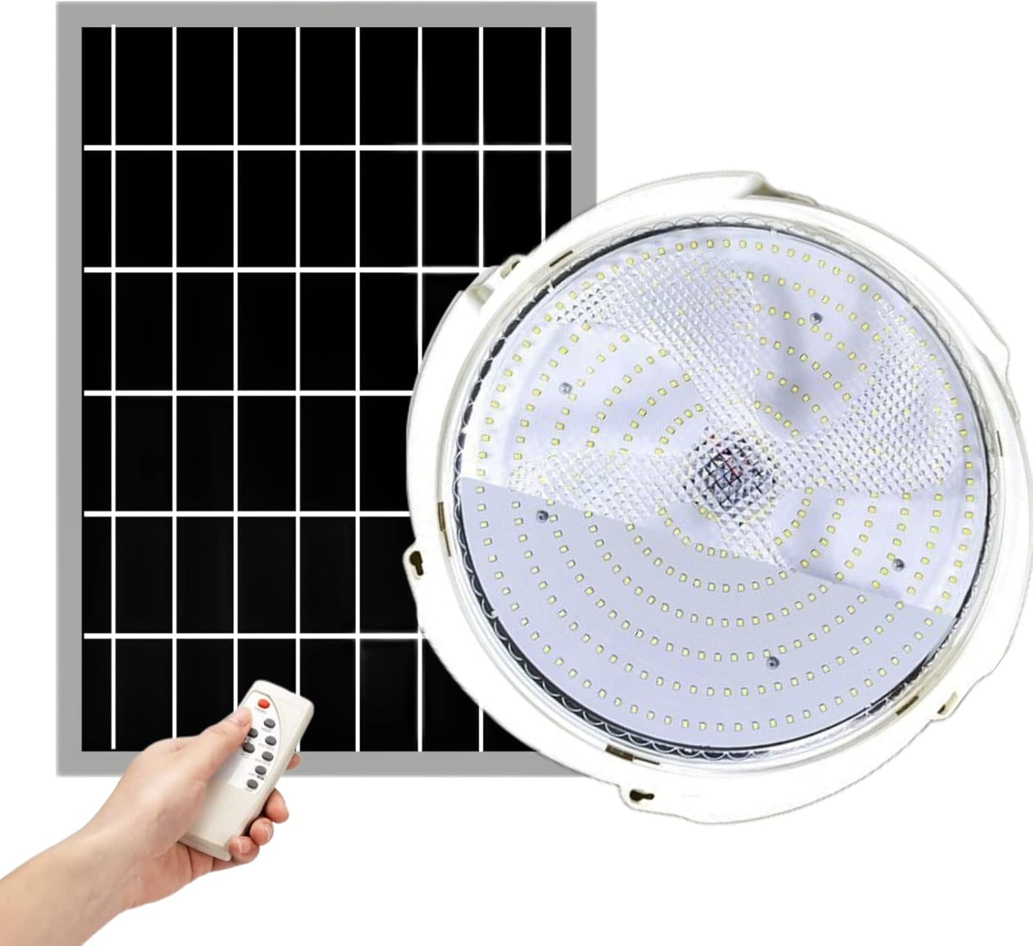 Solar Pendant Lights for Indoor Outdoor LightingEquipped with a remote controller to manually control the light ON/OFF and chose preferred mode and adjust light brightness.Our solar led pendant lights have a good rust resistance and with IP65 water resistant, it's very suitable for outdoor and indoor use.Great solar indoor/outdoor ceiling light for shed, barn, porch, stable, room, patio, gazebo, chicken coop etc.Solar shed light comes with a full set of mounting accessories, the installation is very simple, you just need to fasten the light and install the panel in direct sunlight.Product SpecificationWattage:60W/100W/200W/300WMaterial: ABS plasticWaterproof Level: IP65Charging Time: about 6 hoursWorking Time: 6-8 hours at 100% brightness, 10-15 hours at 50% brightness.Cable Length: 15.6ftSensing Distance: 8-10 meterUsage Scenarios: Availalbe for indoor & outdoor lightingWarm Tips of Installation & Use:Please install the lamp in an open place, and make sure the solar panel be facing with sunlight directly without any shelter or glass;Please make sure the lamp is charged by sunlight at least 8hrs before initial use;Please make sure the solar panel won't be illuminated by other light sources;Please remember to connect the solar panel & flood light with waterproof connector before charging.Package Included:1 x Solar ceiling light1 x Solar panel1 x Remote control1 x Waterproof cable1 x screw mounting kit