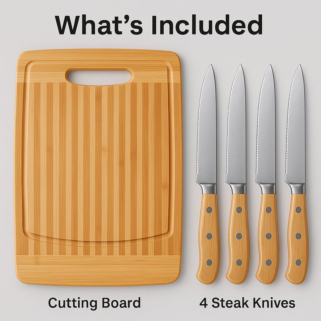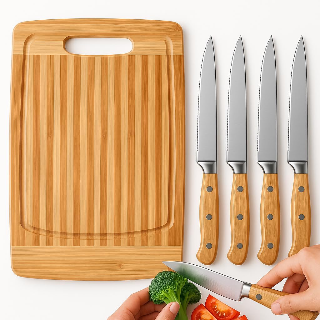 Upgrade your kitchen with this versatile Striped Bamboo Cutting Board and Steak Knife Set, designed for everyday prep, serving, and dining. Crafted from durable bamboo, the cutting board features a smooth, knife-friendly surface that helps protect your blades while providing a sturdy workspace for slicing fruits, vegetables, meats, and more. The integrated handle makes it easy to carry, serve, or store when not in use. Paired with the cutting board is a 4-piece set of stainless steel steak knives. Each knife features a sharp, serrated stainless steel blade and a natural wood handle for a comfortable, balanced grip. The full-tang design provides added stability and durability, making these knives a reliable choice for everyday meals or entertaining guests. Whether you’re prepping meals, serving appetizers, or setting the table, this cutting board and knife bundle offers a practical and stylish solution for any kitchen.