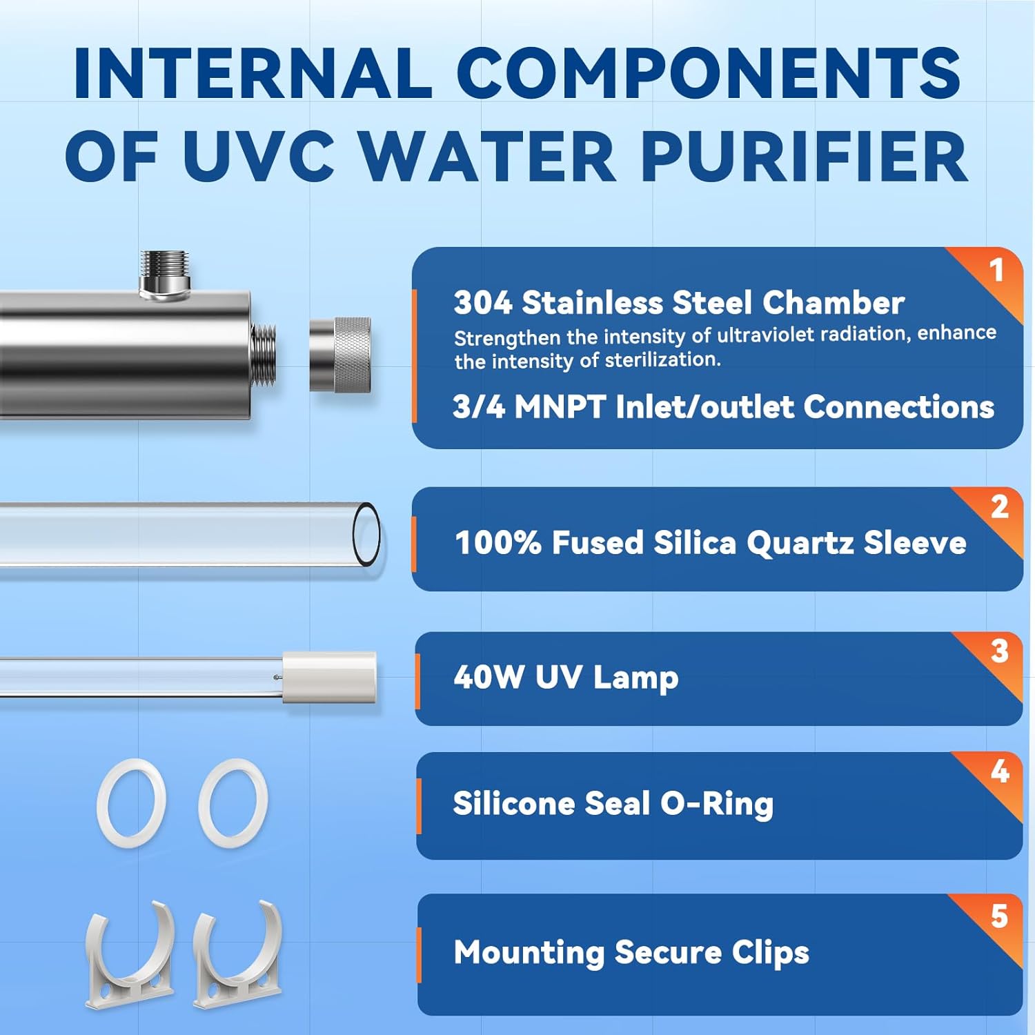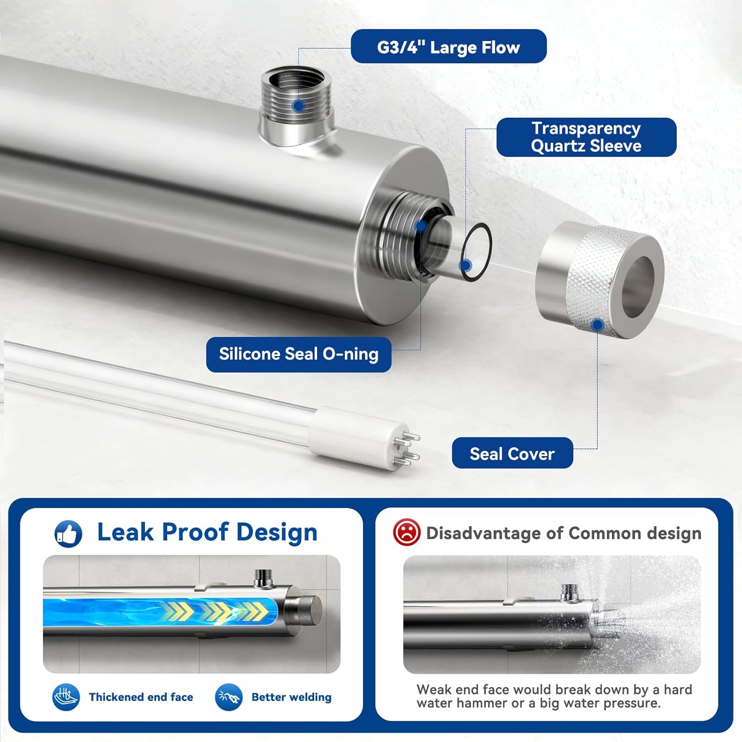| Included Components | Stainless steel shell, UV lamp, Power adapter, Several o-rings, Quartz casing |