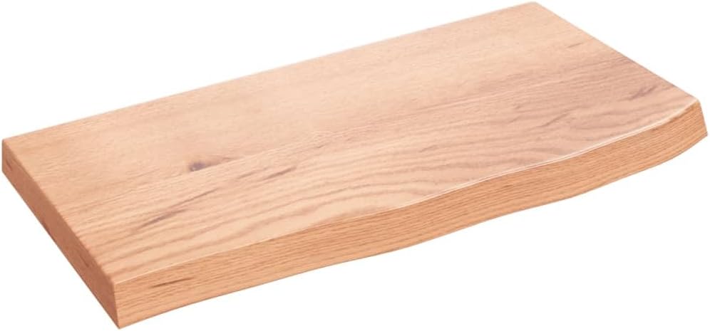 Do you need more storage options but don't have any spare space? This wall shelf in rustic style is a great solution.Durable construction: The wall shelf is made of solid oak wood, which is a beautiful natural material. Oak wood has a medium brown color and a dense grain, contributing to its unique look. Due to the hinge design, it can be folded and stored in narrow spaces.Versatile applications: Besides a shelf, this storage shelf can be combined with different bases according to your needs. It can be used as a bathroom top, cabinet top, desk top, table top etc.Treated surface: The wooden shelf has been varnished so it is ready for use as an additional finish is not required.Handmade with live edge: This shelf board is handmade with a live edge. Due to that the knots, cracks, slightly curved shapes, and color tones are part of the oak wood, every piece of shelf has its own unique character to display. The delivery is random, ensuring the exclusivity and individuality of your product.Good to know:As a natural product, wood may show knots and imgreations that we fill with black fillings to ensure a smooth appearance.Color: Light brownMaterial: Solid oak wood with a varnish finishOverall dimensions: 70.9" x 23.6" x (0.8"-2.4") (L x W x T)Max. load capacity with base support: 95.2 lbFeatures live edgeCalifornia Proposition 65