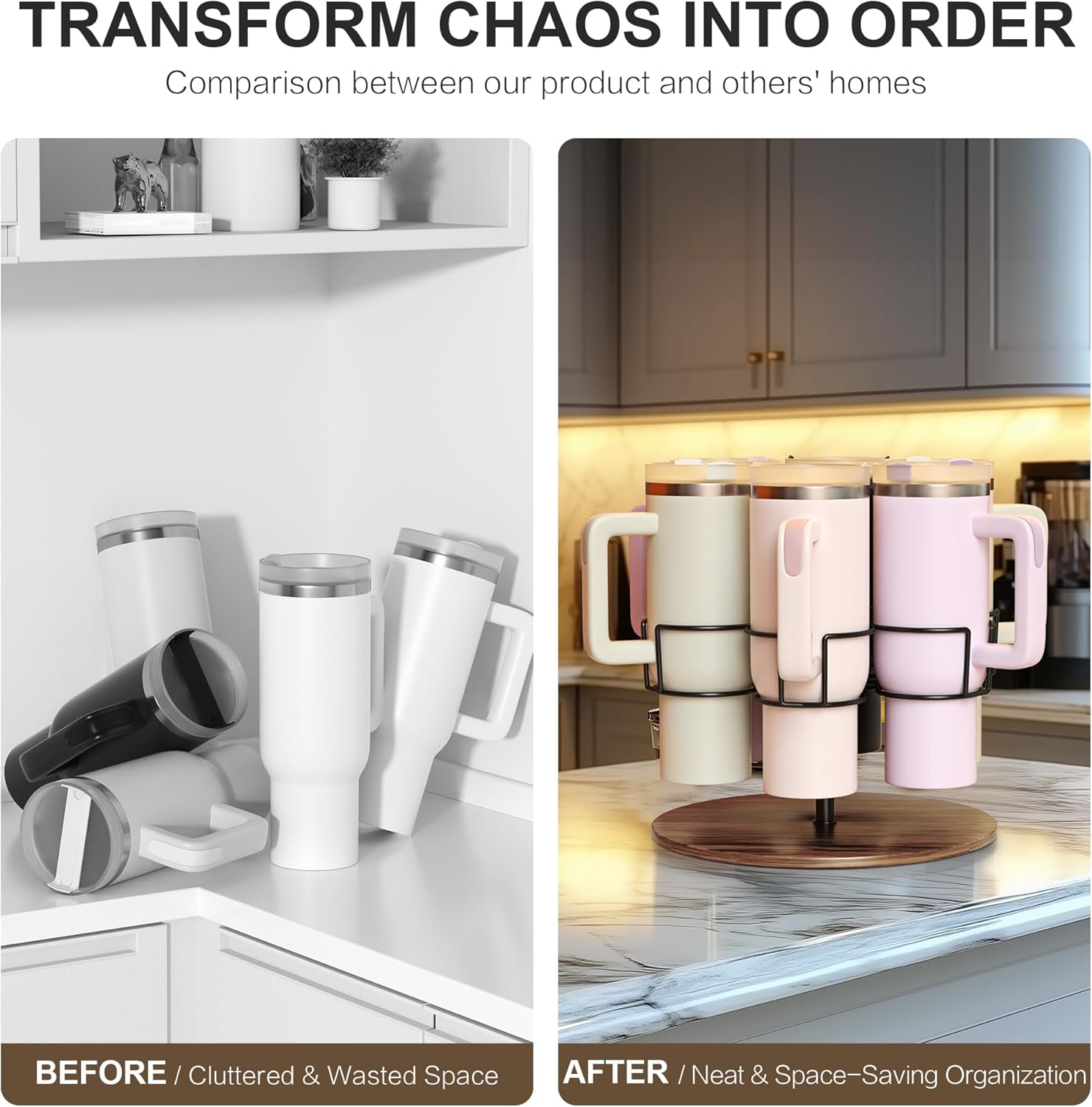 Keep your tumblers organized with this versatile holder, designed for use with Stanley tumblers. Perfectly compatible with 30oz and 40oz sizes, this organizer fits effortlessly on countertops or inside cabinets thanks to its adjustable height. The 360-degree rotating base ensures easy access, allowing you to grab your favorite tumbler for Stanley or other compatible cups with ease. This organizer is designed for efficient draining, holding tumblers upside down to prevent water buildup and keep them clean. The built-in straw slots offer additional storage for all your accessories for Stanley tumblers, keeping everything neat and within reach. Crafted from durable carbon steel with a rustic wooden base, this organizer combines functionality with style. Whether you’re looking for storage for Stanley accessories or a convenient drying rack, this holder is the perfect addition to any kitchen or office.