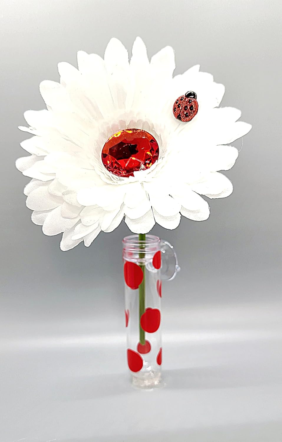 Adorable daisy with vase is compatible for any vehicle. Flower measures 4.5 inches in diameter. suction cup vase sticks to any clean flat surface. Measures 4 inches long. Cute white daisy has a cute red bling center and is ready to soak up the sun! Makes a wonderful gift.