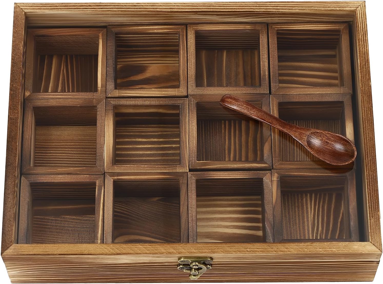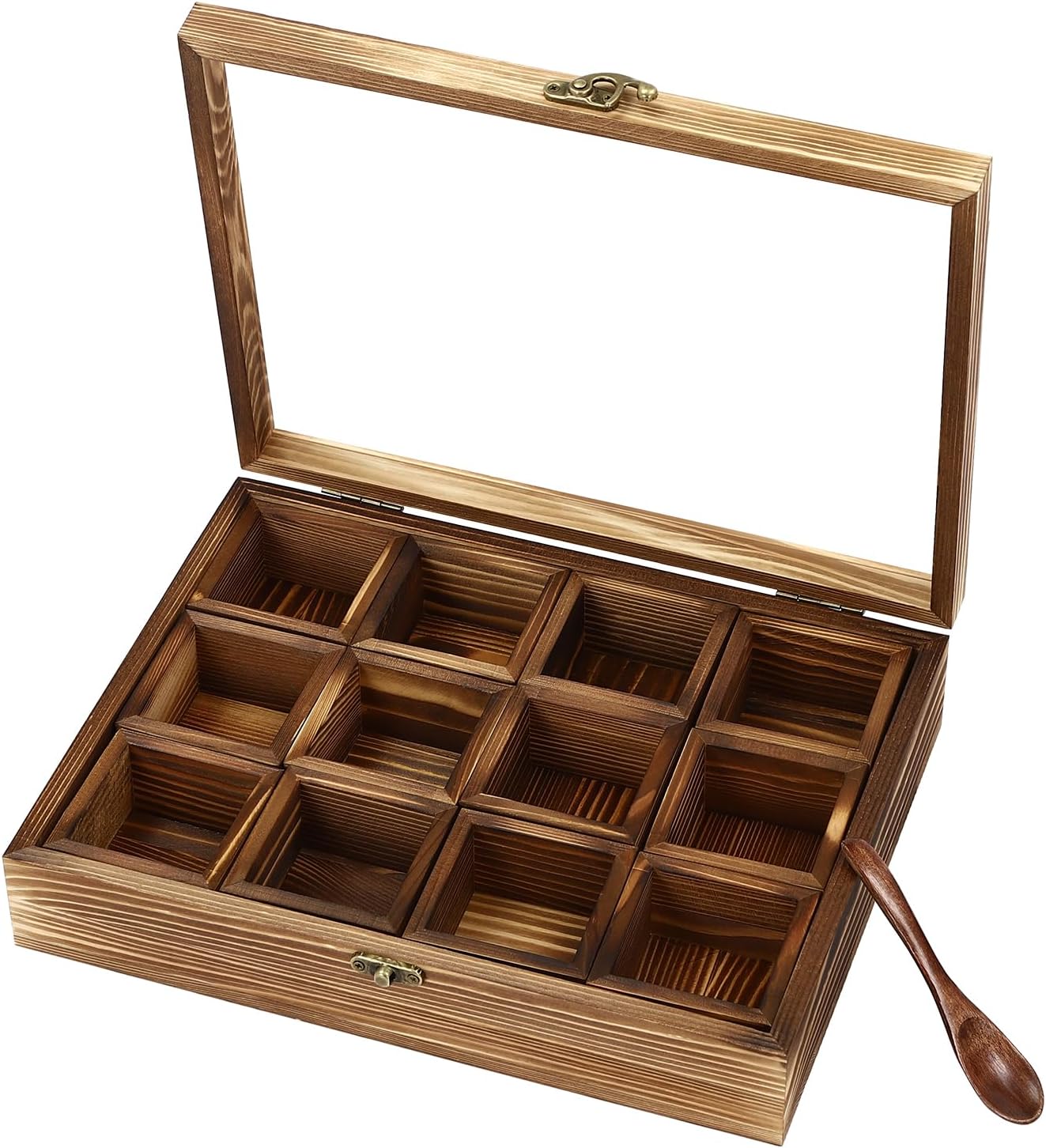 DescriptionThis 12-compartment wooden spice box is ideal for home and restaurant storage needs, keeping storage areas clean and tidy. It is made of high-quality pine wood, glass and hardware through the pine carbonation process, which is lightweight overall. The large capacity of 12 compartments allows you to store different kinds of spices. The matching spoon makes it easy to pick spices or teas. It is ideal for storing spoons of spices and teas, come and bring it home!DetailsWooden SpoonSafety LatchClear LidApplicationIt is ideal for storing up to 12 different spices or teas in the kitchen, living room, restaurant, teahouse, etc. With the container removed, it can also be used to store trinkets or as a pill box.SpecificationsColor: BrownMaterial: Pine Wood, Glass, HardwareProcess: Pine CarbonizationStyle: RetroMount Type: CountertopIndoor/Outdoor Use: IndoorAssembly Required: NoStyle: RetroEach Compartment Capacity: About 45ml/0.01galNumber of Compartments: 12Gross Weight: 0.5kg/1.1lbsNet Weight: 0.4kg/0.88lbsEach Compartment Size: 6.8*6.8*4cm/2.68*2.68*1.57inProduct Size: 30*22.5*7cm/11.81*8.86*2.76inPackage Size: 32*23*7cm/12.6*9.1*2.8inPackage Included1*Wooden Spice Box1*Wooden SpoonNotes1.Please note the size of the product before purchasing.