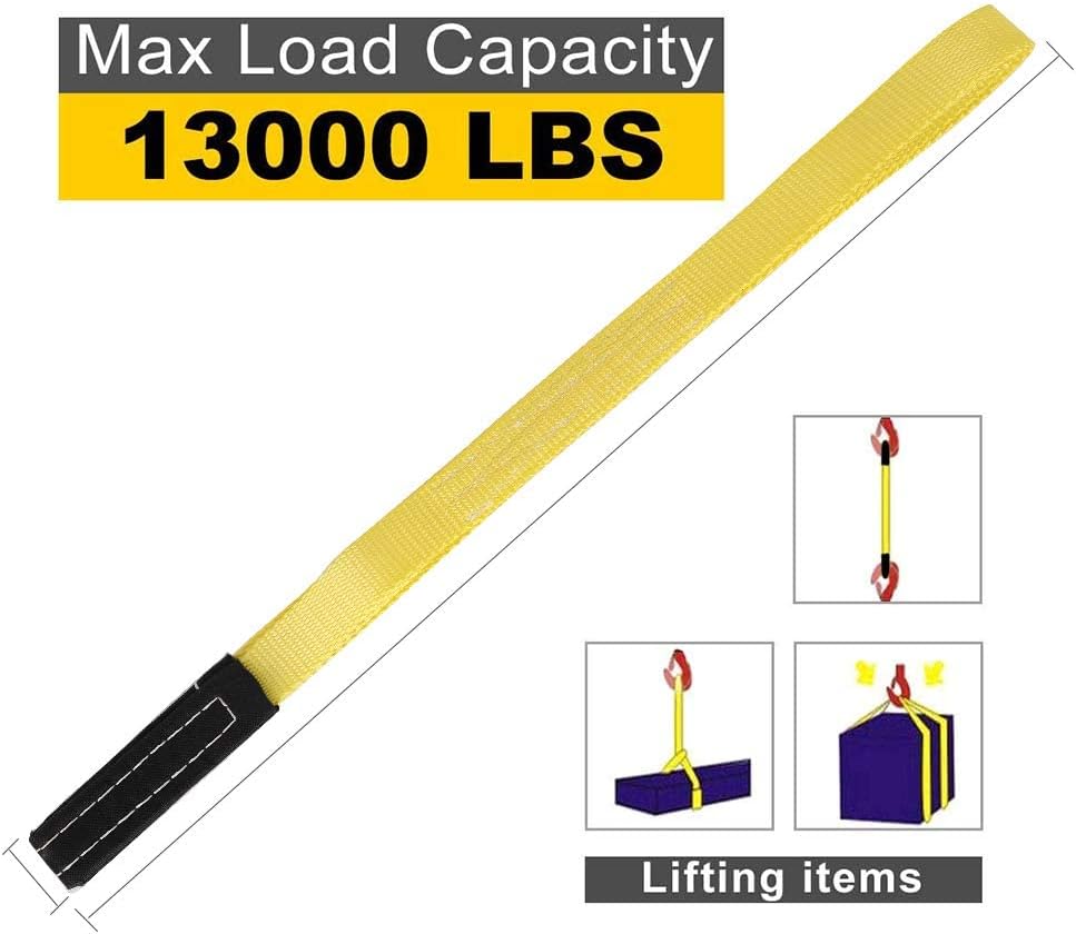 Name: 1PK 65 FT Rope Hoist and 2PK 8' x 1" Lift Sling Material: Rope Hoist: Soft loop, Strong, long lasting polypropylene rope, advantage: feels good to use, disadvantage: soft rope tangles easily; Lift Sling: Made from 100% polyester which has good resistance to UV radiation and won’t fade Rope hoist: 2000 lbs Load Cap, 4000 lbs Breaking Strength Lift Sling: 1333 lbs Load Cap, 4000 lbs Breaking Strength Perfect for sportsman: hunting, boating, shop, and many more uses. Name: Lift Sling Web Strap Quantity: 6pcs Sizes: 8' x 1" Color: Yellow Load Up: 1333lbs Break Strength: 4000lbs